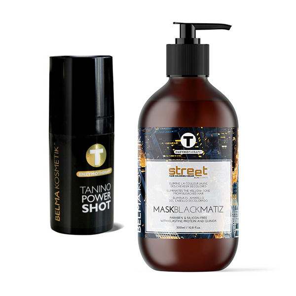 READ MORE + Mask Black Matiz: The mask Street Mask Black Matiz eliminates the yellow pigment of bleached hair quickly and easily transforming them into trendy colours: Metalized, silver and grey. HOW TO USE: Tanino Power Shot: Mask Black Matiz: Thanks to its organic components of the Tanino Power Shot + Mask Black Matiz: jojoba oil, avocado oil, olive oil and argan oil, and the enzymes that catalyse the reaction, achieving a warming effect on the hair, in only 15 minutes we obtain an instant reconstruction of the hair fibre. Helps restore the kinetic structure of the hair, providing the necessary elements to repair the hair fibre. Contributing to hydrate, repair, and revitalise the hair recovering its shine, flexibility and silkiness. Tanino Power Shot: Aqua, Oxoacetamide Amino Acids, Cetyl Alcohol, Hydroxyethyl Cellulose, Oxoacetamide, Carbocysteine, Glycerin, Paraffinum Liquidum, Hydrolyzed Keratin, Stearamidopropyl Dimethylamine, Silk Amino Acidsm Hydrolyzed Collagen, Hydrolyzed Wheat Protein, Argania Spinosa Kernel (Argan Oil) Oil, Polyquaternium-11, Ubiquinone, Lupinus Albus Seed Oil, Triticum Vulgare Germ Oil, Tannic Acid, Madelic Acid, Phenyl Dimethicone, Cyclopentasiloxane, Dimethicolon, Cyclomethicone, Shea Butter Cetyl Esters, Shea Butteramidopropyltrimonium Chloride, Persea Gratissima Oil Fragrance, Panthenol, Phenoxyethanol, Thhyllhexylglycerin, EDTA. Mask Black Matiz: Aqua, Cetearyl Alcohol, Cetyl Alcohol, Dimethicone, Cetrimonium Choloride, Cyclopentasiloxane, Ricinus Communis Sead Oil, Butyrospermum Parkii Butter, Glyoxyloyl Carbocysteine, Quaternium-91, Cetrimonioum, Methosulfate, Polysorbate 60, Trymethilsolixyphenyl, Hydrolyzed Rice Protein, Hydrolyzed Collagen, Silk Amino Acids, Hydrolyzed Silk, Hydrolyzed Keratin, Parfum, Citric Acid, Sodium Hyaluronatte, Benzyl Alcohol, Glyoxyloyl Keratin Amino Acids, Methylchloroisothiazolinone, Methylisothiazolinone, Basic Blue-99, Basic Brown-16.